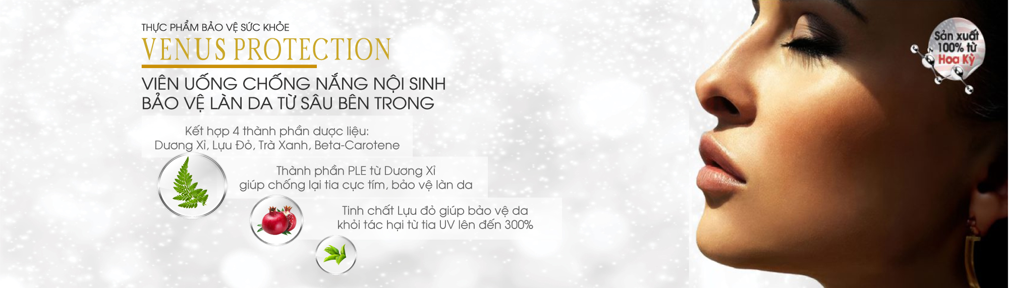 Sản xuất tại Mỹ, sản phẩm Venus đã được chứng minh lâm sàng là thực phẩm bảo vệ sức khỏe hỗ trợ làm đẹp da dưới dạng uống. Sản phẩm này giúp làm sáng da, mang lại làn da trắng hồng mịn màng, chống lão hóa, giảm nếp nhăn và bảo vệ da khỏi tác hại của tia UVA và UVB.​
